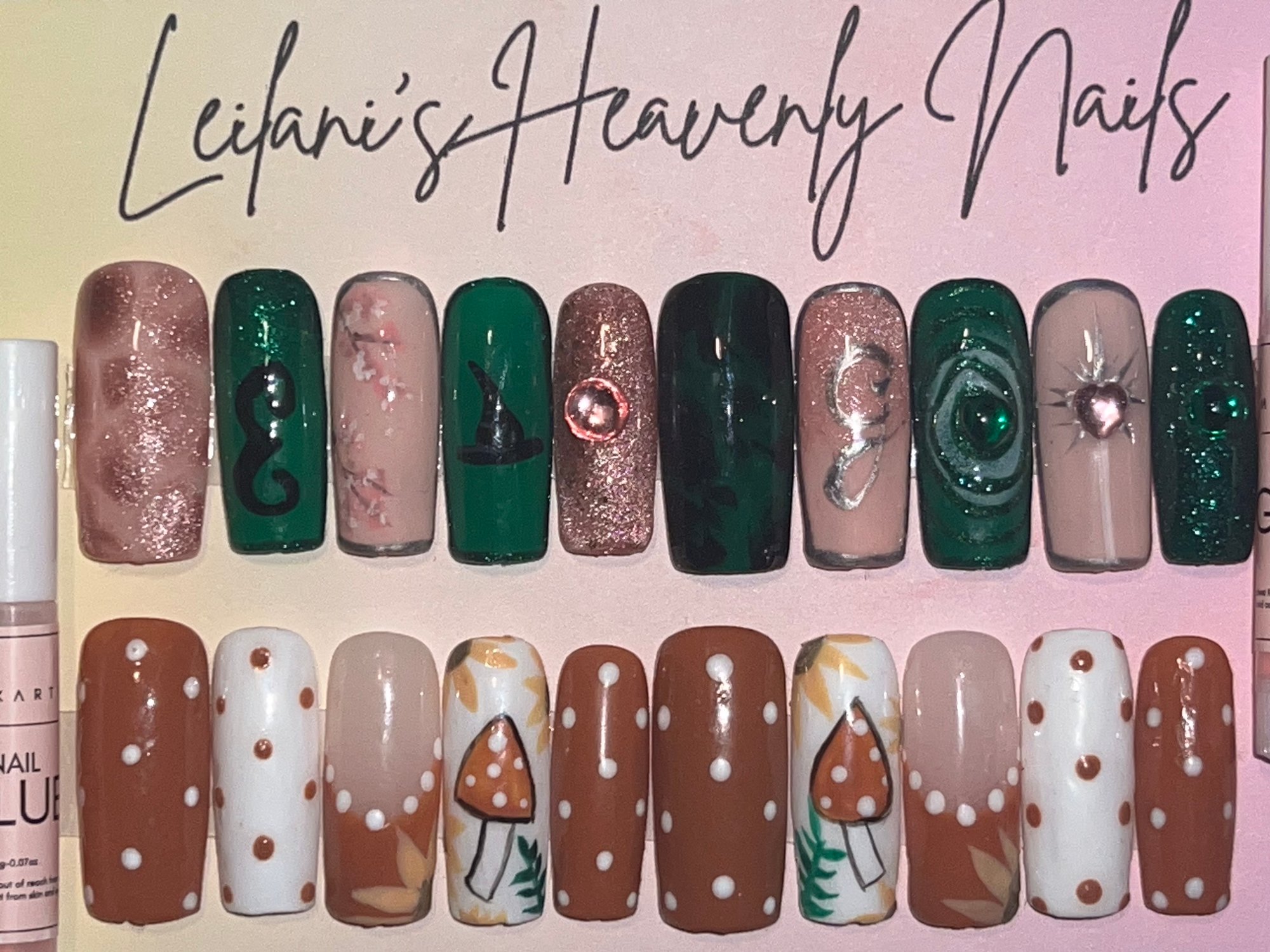 One set brings the dark forest to your fingertips with shimmering rose gold glitter, deep emerald green, and mystical swirl designs accented with delicate silver details and sparkling gems. 🔮