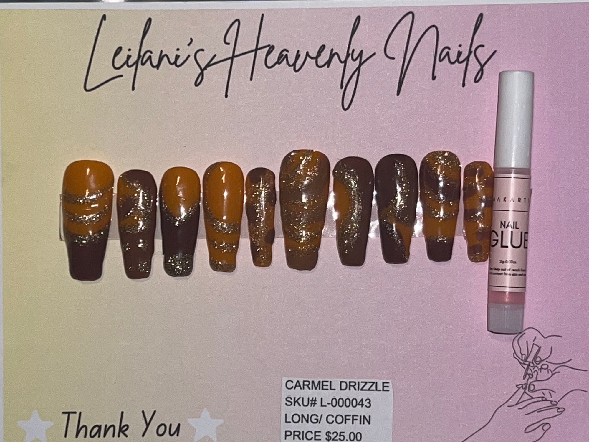 Indulge your sweet tooth with our delicious "Caramel Drizzle" press-on nails! These long coffin-shaped nails are serving up serious autumnal vibes and sophisticated sparkle.
