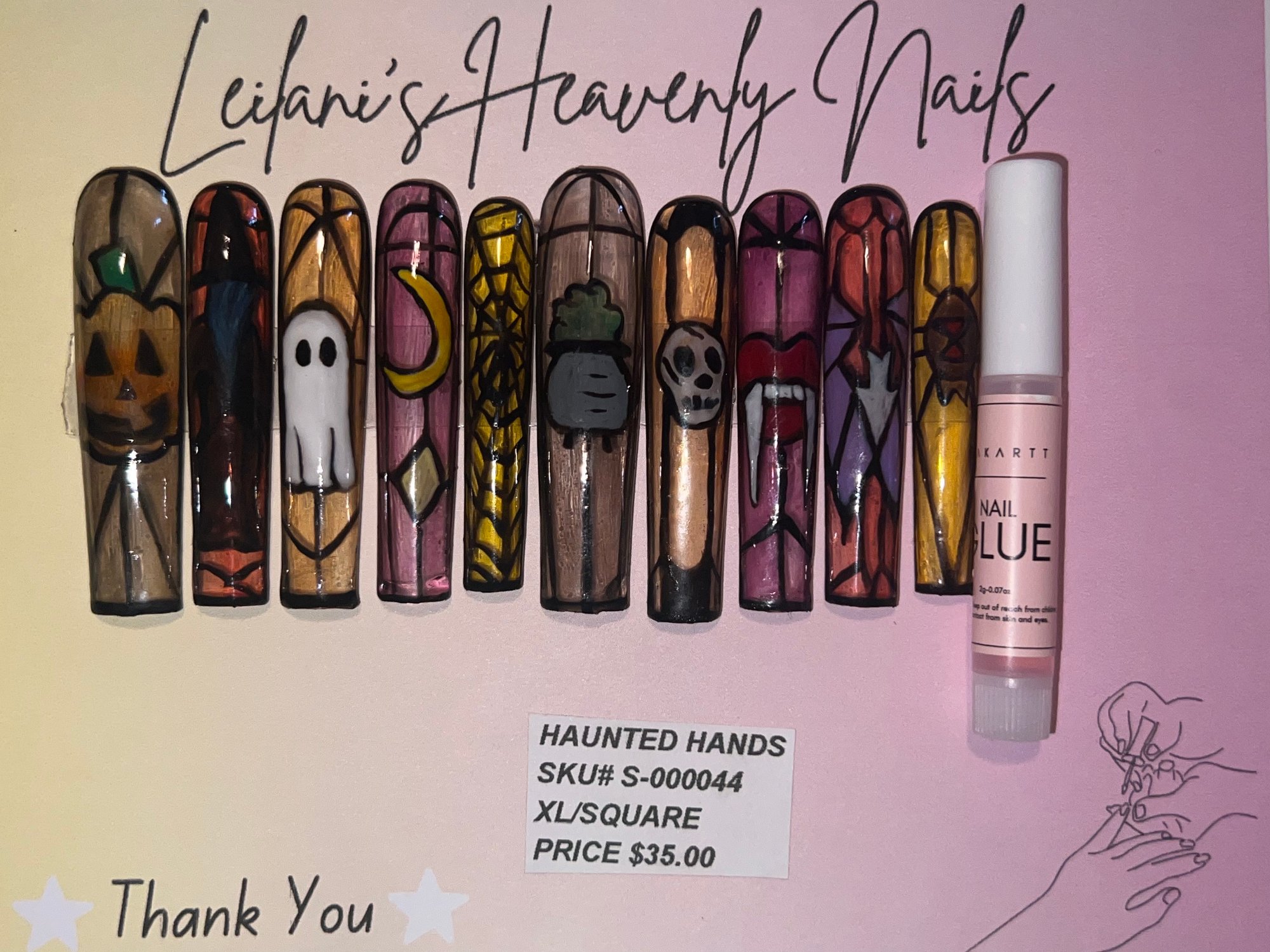 These XL long/square nails feature a unique, translucent "stained glass" effect with iconic Halloween designs.
