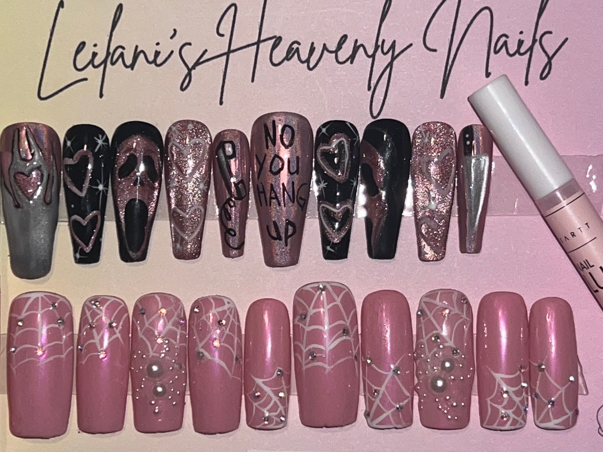 Get ready to slay with this spooktacular collection that features two sets of press-on nails: one with edgy black and glitter designs including a "ghost face" and the iconic "NO YOU HANG UP" phrase, and another set of sweet pink nails adorned with delicate spiderwebs and sparkling gems. Perfect for adding a touch of horror-chic to any look! Get yours nowโจ