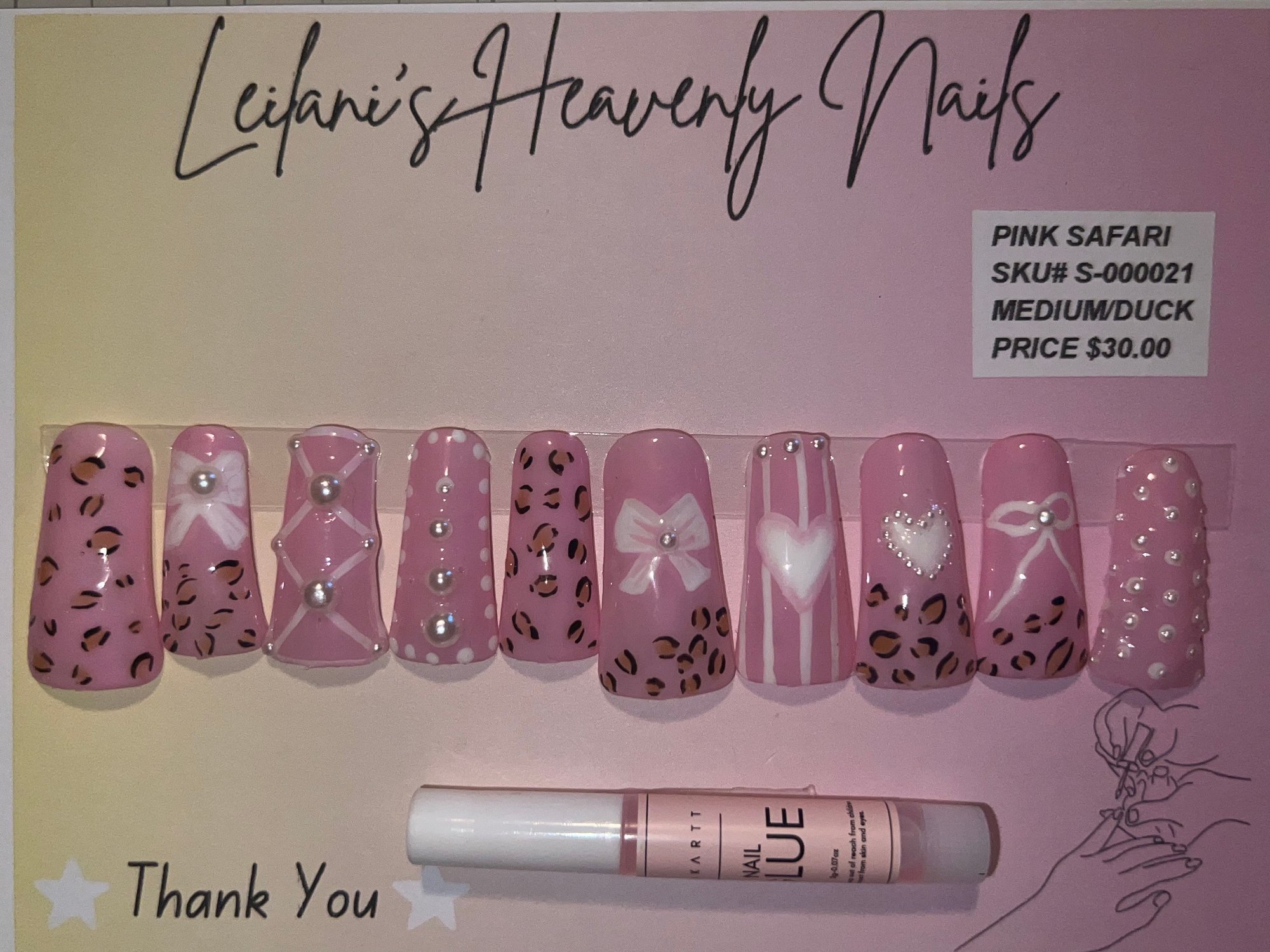 Unleash your wild side with our fabulous Pink Safari set! These medium/duck shaped nails mix chic animal print with sweet, sparkling details.