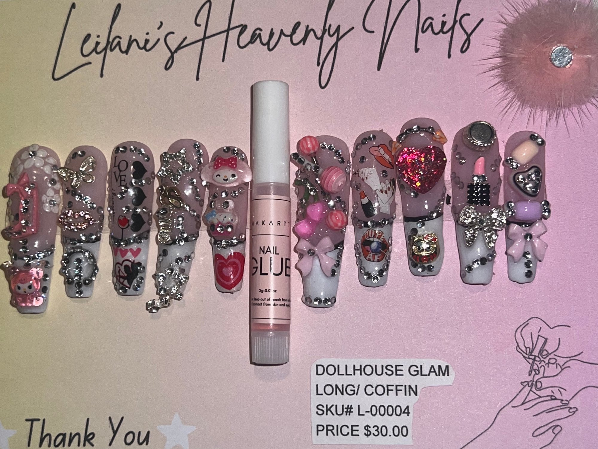Step into luxury with our Dollhouse Glam set — the perfect blend of cute, classy, and over-the-top sparkle. Each nail is handcrafted with love and packed with 3D charms, rhinestones, glitter accents, and pops of pink that scream high glam energy.