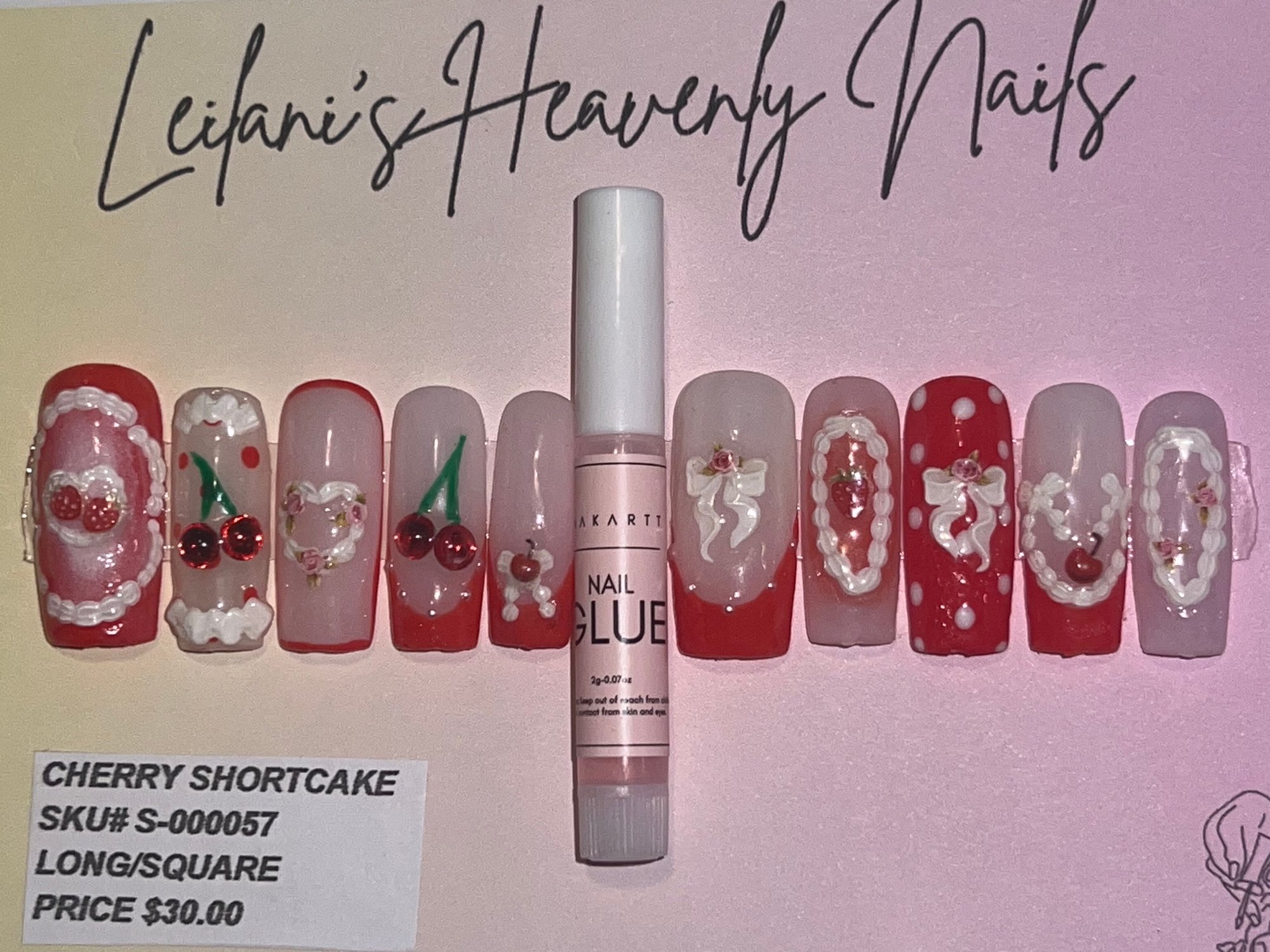 Indulge in the sweetest style with our delicious "Cherry Shortcake" press-on nails! These long square-shaped nails are a delightful blend of vintage charm and sweet treats.
