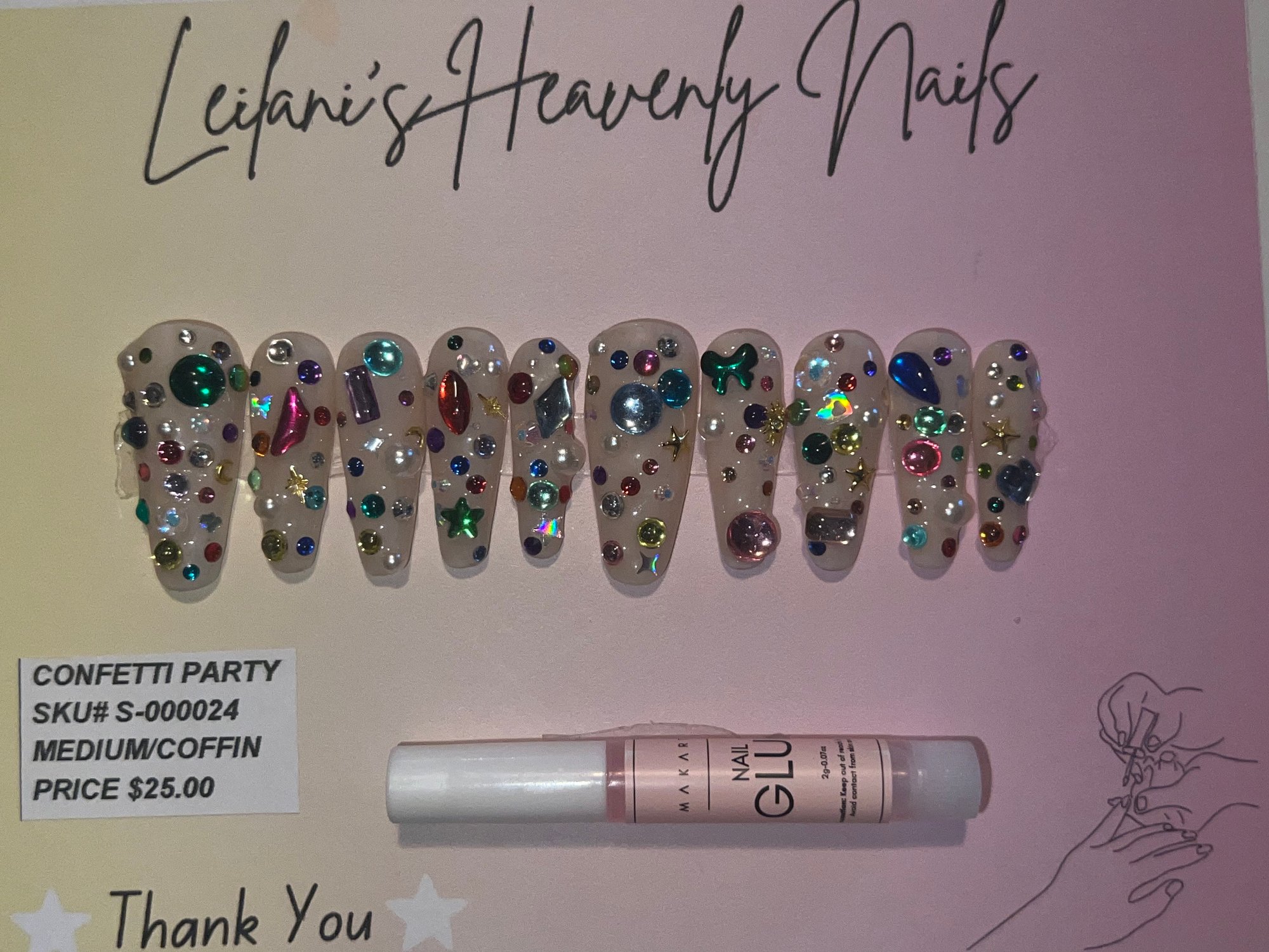 Each set is crafted with love and attention to detail, ensuring you get salon-quality glam that you can apply right at home. Whether you’re hitting a party, a night out, or just love to shine, these nails bring instant confidence and personality to your fingertips.