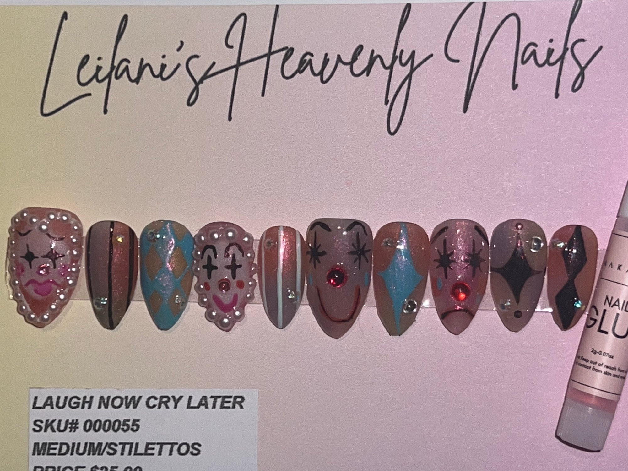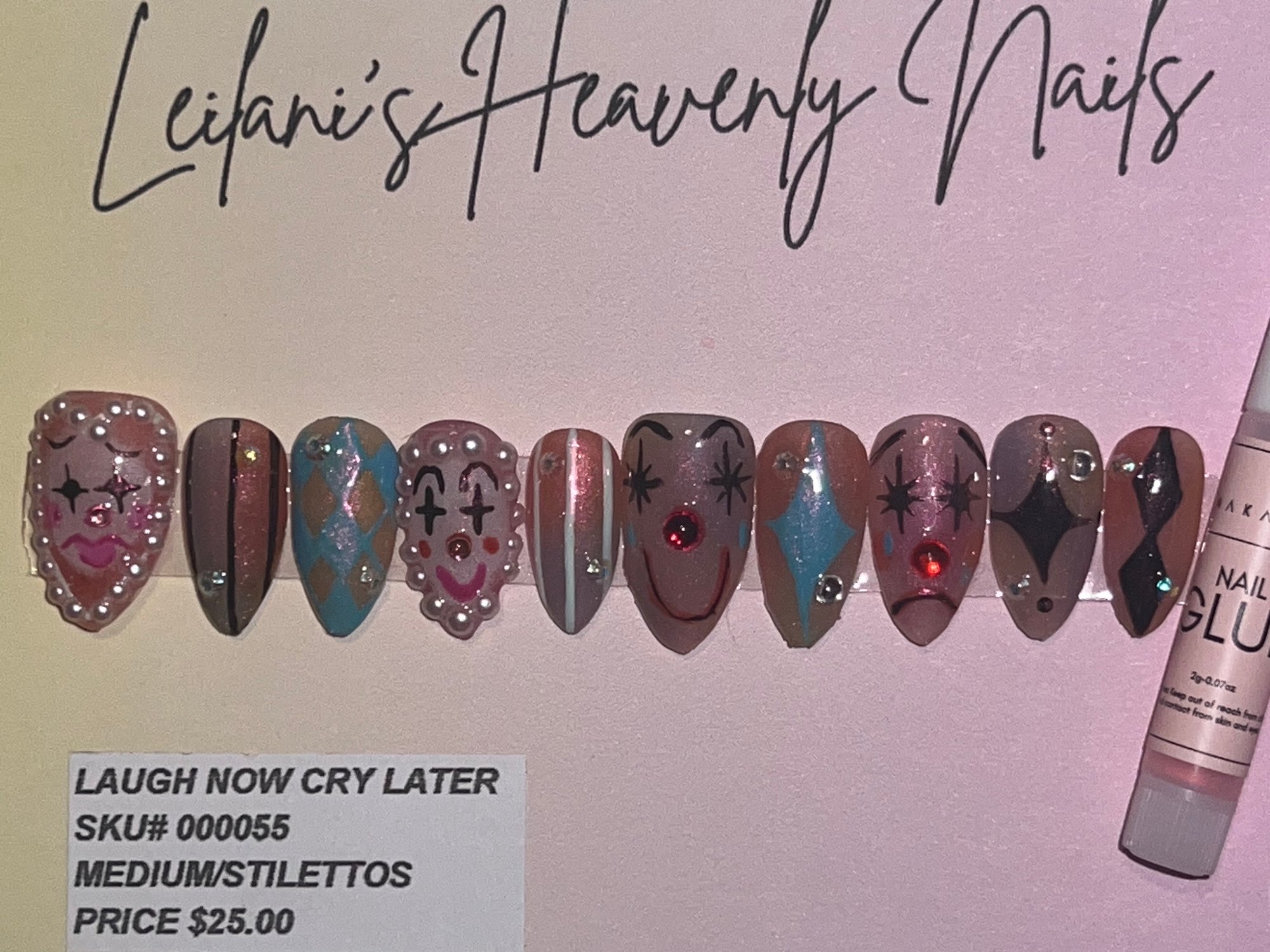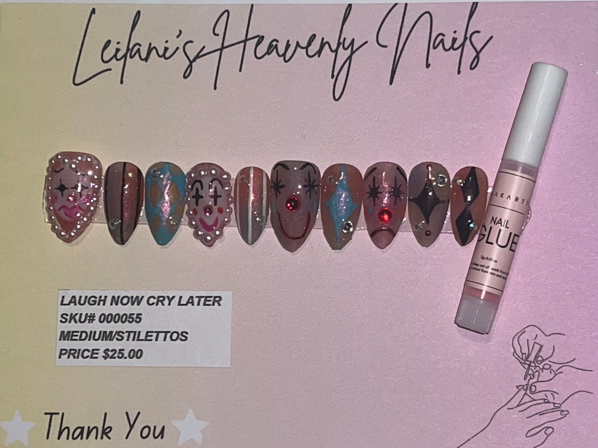 Embrace the drama and artistry with our unique "Laugh Now Cry Later" press-on nails! These medium stiletto-shaped nails are a bold statement, blending playful clown aesthetics with a touch of melancholy.