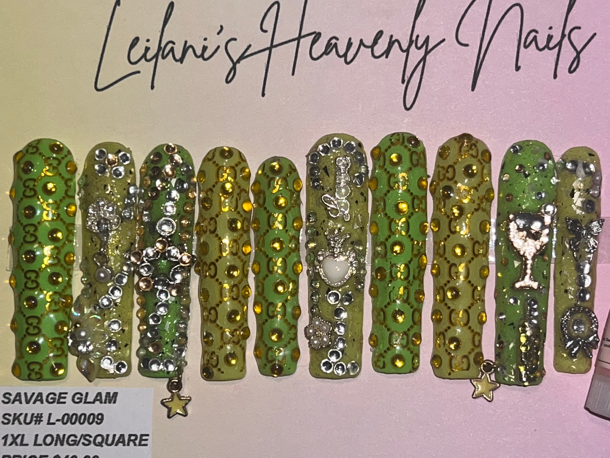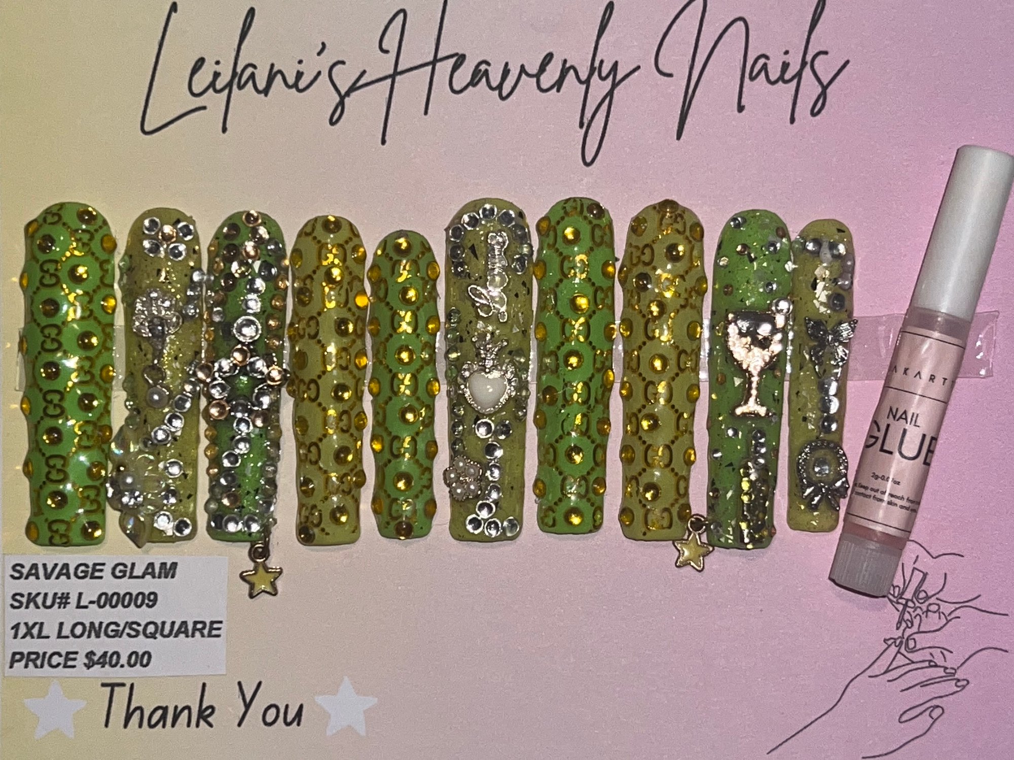 Unleash your inner icon with our fiercely fashionable "Savage Glam" press-on nails! These 1XL long square-shaped nails are dripping in designer-inspired style and blinding bling.