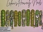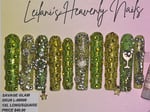 This show-stopping set features a bold, custom lime green base overlaid with a glittering gold-toned pattern. Every nail is absolutely drenched in a sparkling mix of silver and gold rhinestones and adorned with glamorous charms, including stars, designer logos, and even a tiny goblet! ✨🥂