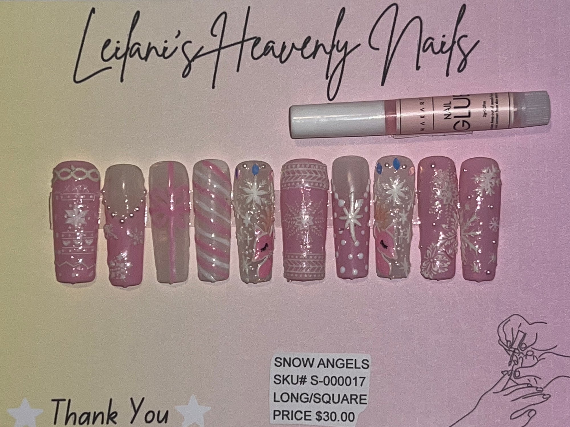 Float into a winter wonderland with our enchanting "Snow Angels" press-on nails! These long square-shaped nails are absolutely perfect for bringing a touch of delicate, frosty magic to your fingertips.