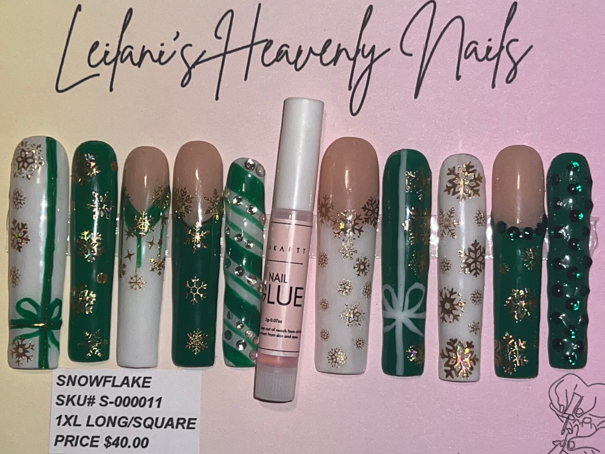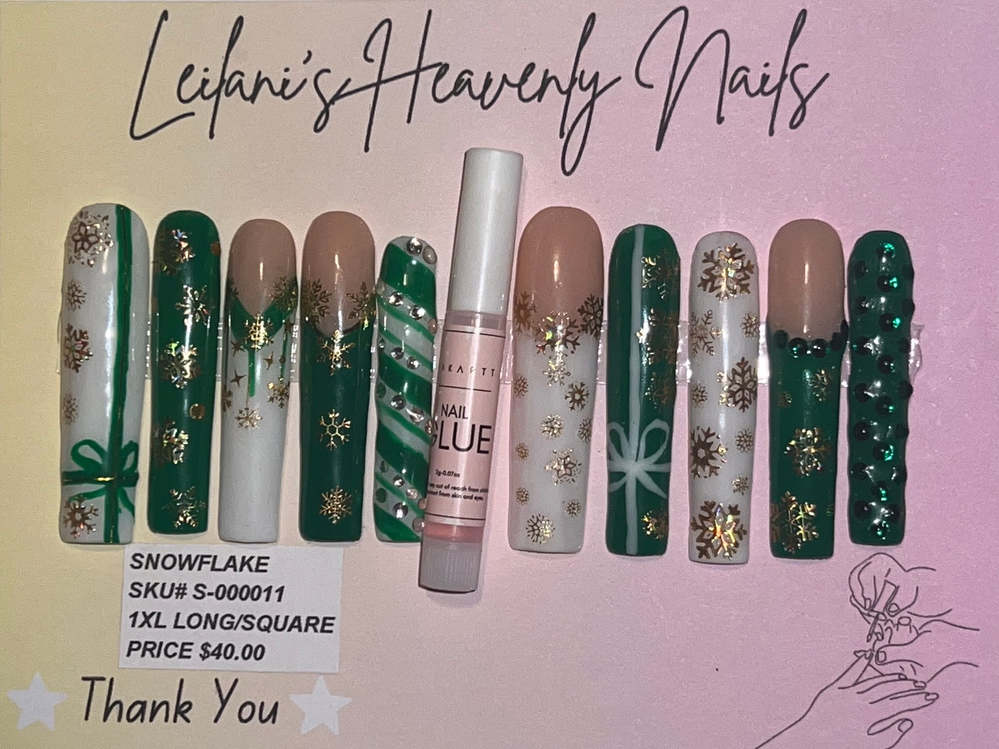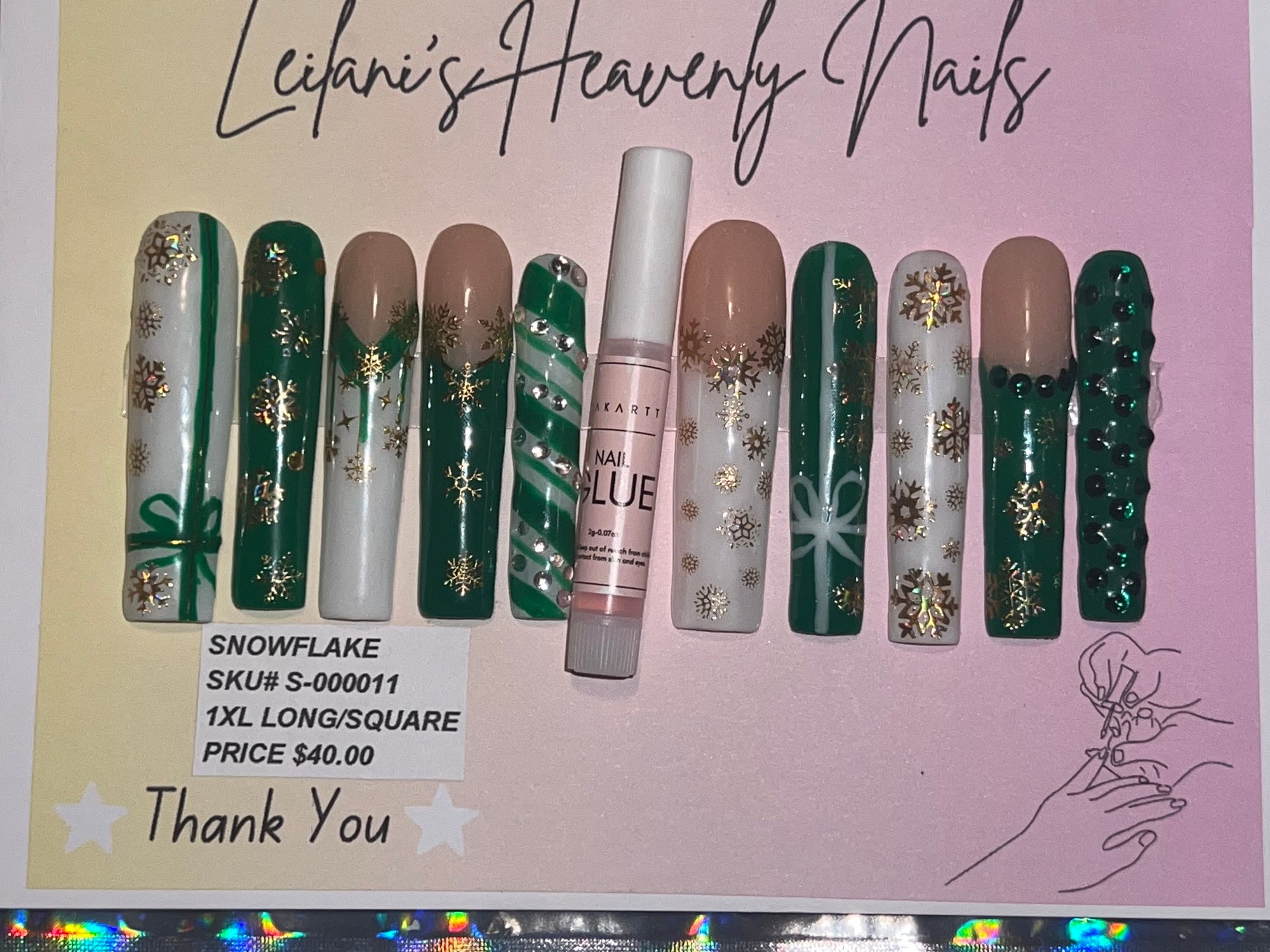 Deck your hands with the ultimate festive luxury! Our dazzling "Snowflake" press-on nails are 1XL long square-shaped masterpieces, perfect for shimmering through the winter season. This elegant set features a stunning holiday palette of deep emerald green and pure white, contrasted with a chic nude base on some nails. Each press-on is adorned with intricate gold foil snowflakes, sparkling bows, and classic candy cane stripes, finished with a dazzling glitter nail to complete the look. ✨🎀