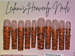 This captivating set features a vibrant tiger print in classic orange and black, creating an unmistakable safari chic look. Each nail is topped with a clear, glossy finish and adorned with dazzling rhinestones along the cuticle, adding an extra touch of glamour and sparkle! 🧡🖤